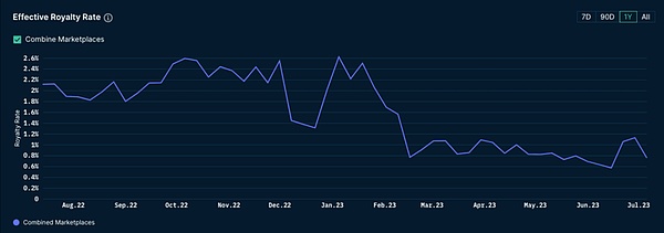 2022年市场峰值过后,随着交易平台间的竞争导致版税在多数市场成为可选条款,创作者版税收入大幅下滑。
