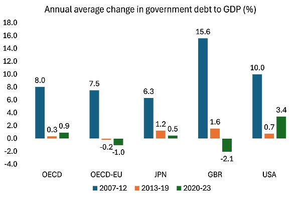 但投资者和企业战略家认为,经济形势中唯一的变数是公共部门。美国政府仍然面临巨额年度预算赤字,从而推高了政府债务水平,进而增加了偿债成本。