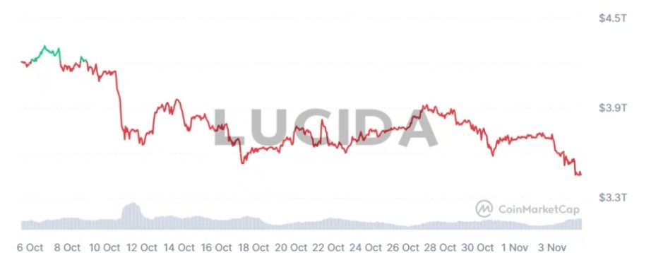 总市值是市场情绪的最终结果和整体体现。它的波动是所有个体代币价格变化、资金流入流出以及市场信心的综合产物。在 10 月,总市值经历了「过山车」般的旅程:在 10 月 5 日,受益于比特币和以太坊的强势上涨,总市值一度创下 4.35 万亿美元的历史新高。然而,在「10·11」暴跌行情中,单日跌幅超过 9%,市值大幅蒸发。截至 10 月底日,总市值回落至约 3.4 万亿美元,这一起一落,深刻揭示了在市场恐慌和去杠杆过程中,财富效应的剧烈收缩。