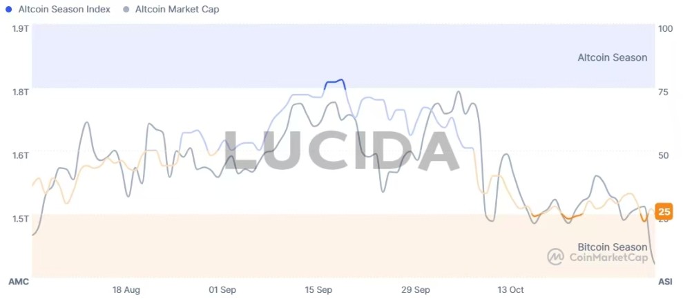 山寨季指数的核心逻辑在于衡量有多少主流山寨币在特定周期内表现优于比特币。当指数低于 75,尤其是处于 20-30 的区间时(即「比特币季」),表明资金正从高风险的山寨币撤出,流向更稳健的比特币,这通常是市场避险时期或牛市初期的特征。这一点在 10 月底得到印证,当时该指数为 32,确认了市场处于避险模式。