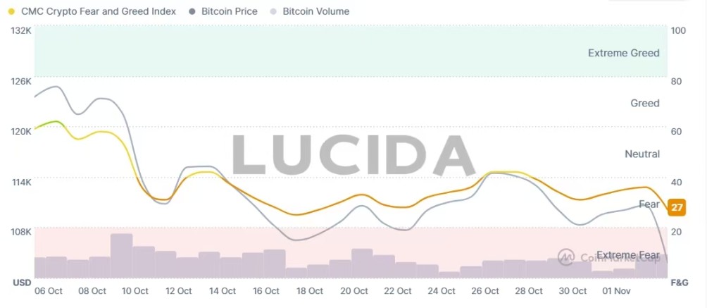 加密恐惧与贪婪指数在 10 月至 11 月初经历了从「贪婪」到「极度恐惧」的剧烈摆动。该指数在 10 月 5 日曾触及 74 的「贪婪」高点,彼时比特币价格也逼近历史峰值。然而,随着市场因宏观担忧(如特朗普的关税威胁)和内部结构性风险(如高杠杆清算)出现暴跌,该指数在 11 月 4 日骤降至 21,进入「极度恐惧」区域。这种情绪的极端逆转,不仅反映了投资者信心的脆弱性,也常常成为判断市场短期超卖或潜在反弹时机的逆向指标——有分析师认为,这种极度的市场担忧情绪可能预示着阶段性的底部正在形成。另外,在 10 月的暴跌中,比特币主导率上升,而市场交易量和社交情绪全线下滑,这些共同将情绪推向了「恐惧」一端。