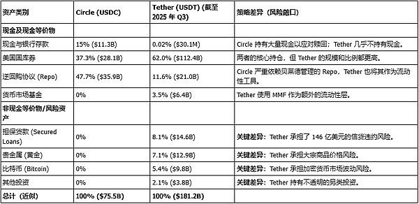 Circle及Tether储备资产构成对比(数据截至 2025 年第三/四季度)
