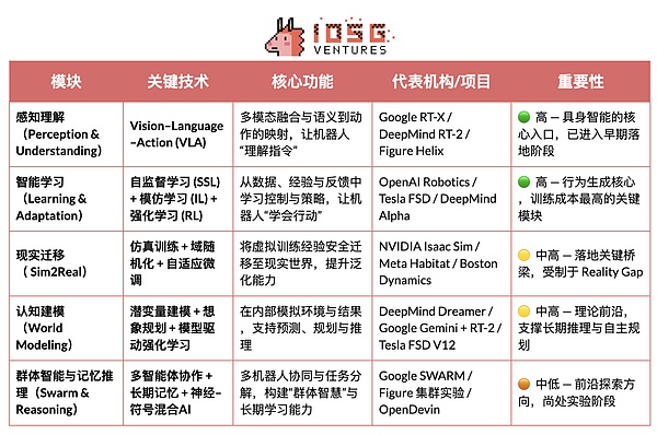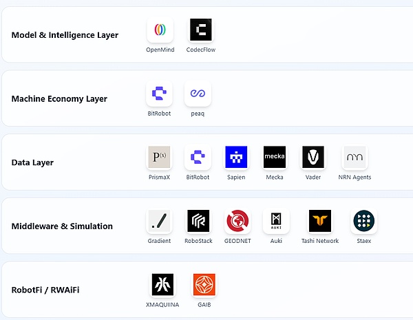 基于“可验证进展、技术公开度、产业相关度”三项标准,梳理当前 Web3 × Robotics 代表性项目,并按五层架构归类:模型智能层、机器经济层、数据采集层、感知与仿真基础层、机器人资产收益层。为保持客观,我们已剔除明显“蹭热点”或资料不足项目;如有疏漏,欢迎指正。