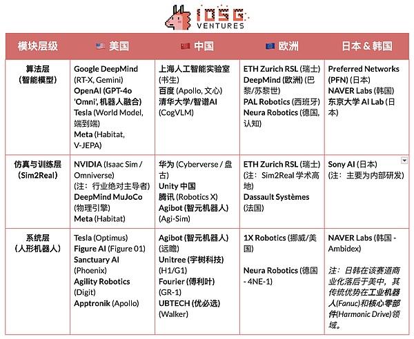 中国凭借规模化制造、垂直整合与政策驱动,在零部件、自动化工厂与人形机器人领域形成领先优势,硬件与供应链能力突出,宇树与优必选等已实现量产,正向智能决策层延伸。但在 算法与仿真训练层与美国仍存较大差距。