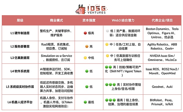 总体来看,短期主要集中在数据采集与激励层;中期有望在“稳定币支付 + 长尾数据聚合”及 RaaS 资产化与结算层实现突破;长期,若人形机器人规模化普及,Web3 或将成为机器所有权、收益分配与治理的制度底层,推动真正的去中心化机器经济形成。