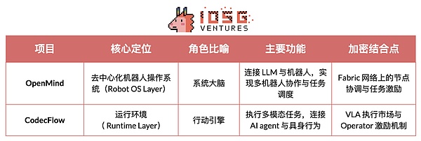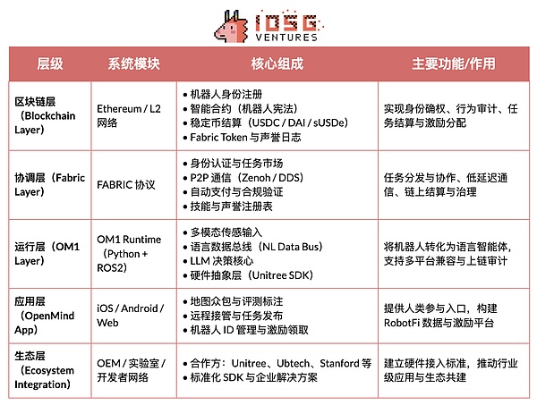 模型智能层(Model & Intelligence Layer)是当前最具长期价值的方向。以 OpenMind 为代表的开源机器人操作系统,尝试打破封闭生态、统一多机器人协作与语言到动作接口。其技术愿景清晰、系统完整,但工程量巨大、验证周期长,尚未形成产业级正反馈。