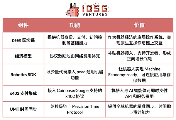 peaq 是专为机器经济打造的 Layer-1 区块链,为数百万台机器人与设备提供机器身份、链上钱包、访问控制以及纳秒级时间同步(Universal Machine Time)等底层能力。其 Robotics SDK 使开发者能够以极少代码让机器人“机器经济就绪”,实现跨厂商、跨系统的互操作性与交互。