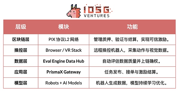 PrismaX 是一个面向具身智能(Embodied AI)的去中心化远程操控与数据经济网络,旨在构建“全球机器人劳动力市场”,让人类操作者、机器人设备与AI模型通过链上激励系统协同进化。项目核心包括两大组件: