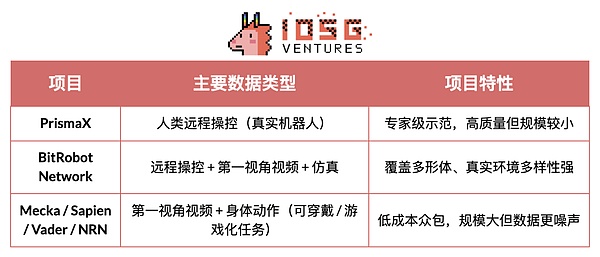 数据采集层(Data Layer) 数据采集层门槛相对最低,但是目前最接近商业可行的方向。具身智能数据采集对时空连续性与动作语义精度要求极高,决定其质量与复用性。如何在“众包规模”与“数据可靠性”之间平衡,是行业核心挑战。PrismaX 先锁定 B 端需求,再分发任务采集验证一定程度上提供可复制模板,但生态规模与数据交易仍需时间积累。