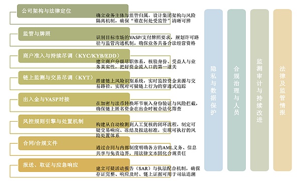 这些层面会像多米诺骨牌一样产生连锁反应,因此,收单服务商不能再只单单专注一个方面,而必须构建一套系统性的合规架构,在“去中心化”的技术世界和“中心化”的监管要求之间,搭建起一座稳固的桥梁。