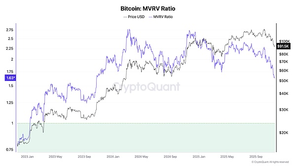 MVRV 是市场价值与实际价值之比,当 MVRV 值升高时,意味着比特币处于估值过高状态。2023 年底 MVRV 跌至 0.8,2024 行情好时曾升至 2.8,2025 年初回调中,MVRV回落至2以下,估值没有高估,也未达到低估水平,整体周期涨跌节奏仍在。