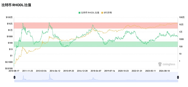 RHODL 是衡量短期持币者(1周)与中长期持币者(1–2年)之间“已实现价值”比值的指标,用于识别市场顶部风险。历史上,该指标进入极高区域(红色带)时,常对应牛市泡沫顶点(如2013、2017)。2021-2022年,RHODL 再度冲高,虽未突破历史极值,但提示市场结构进入后期。如今该指标也进入周期性高点,在某种程度上也预示着价格处于顶部。